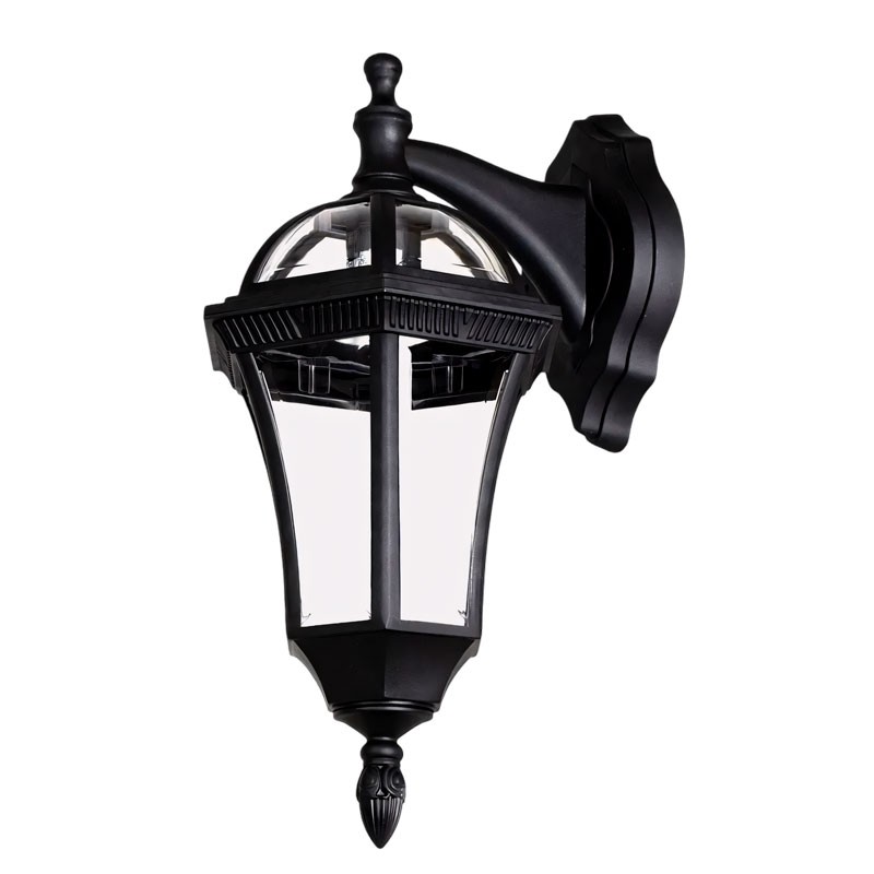Aplique exterior clásico COM en policarbonato negro con portalámpara E27 e IP44. Ideal para iluminar fachadas, entradas y porches con estilo elegante.