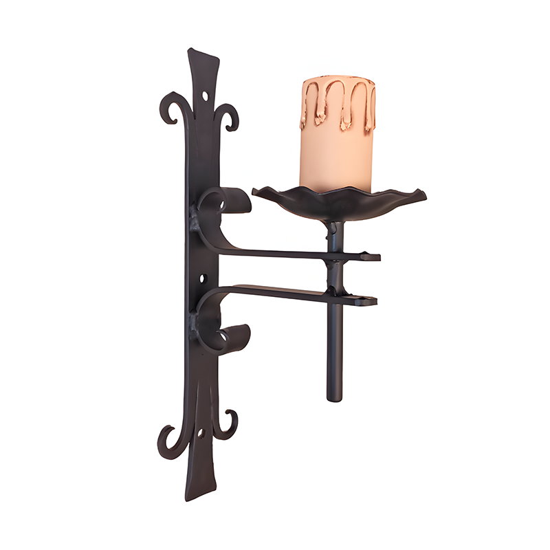 Aplique de pared de forja artesanal, fabricado a fragua con acabado en negro. Diseño rústico con efecto vela. Ideal para casas rurales, bodegas y espacios con encanto.