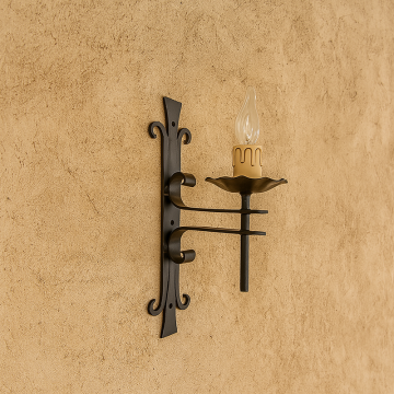 El aplique de pared Forja 6021-1 es una pieza única de iluminación artesanal, fabricada en fragua con técnicas tradicionales de forja. Su estructura de hierro con detalles curvos y su casquillo en forma de vela aportan autenticidad, convirtiéndolo en un elemento decorativo lleno de personalidad.
