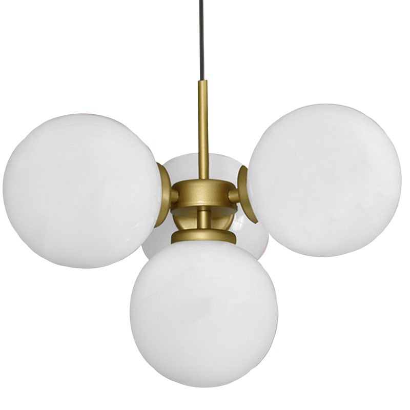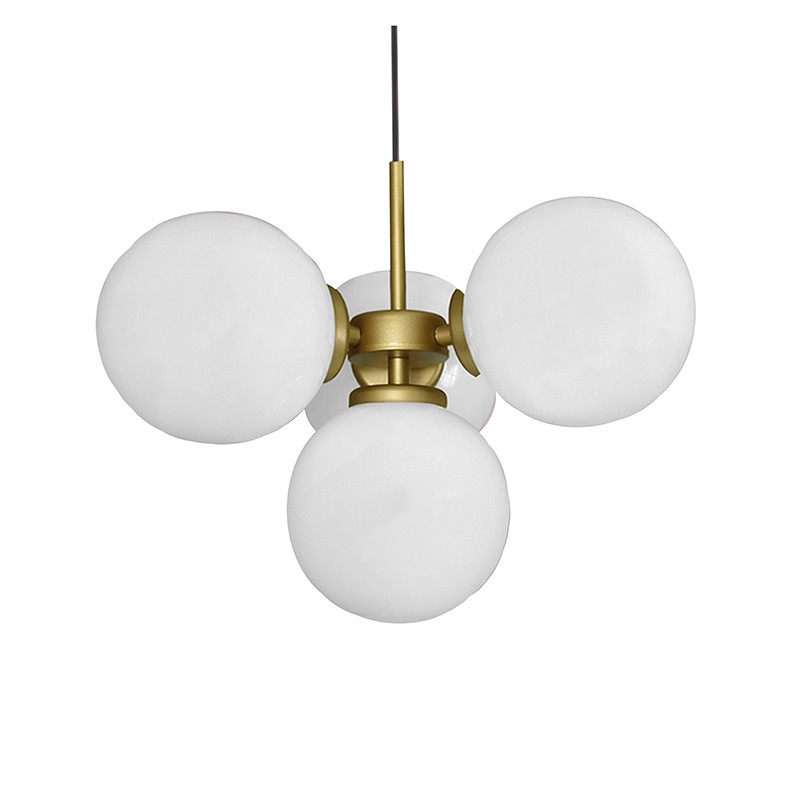 Colgante de techo Bola 430-1, fabricado en metal y cristal, en su terminación en dorado y acompañado por tres bolas de cristal en blanco dando ese toque de estilo moderno. Es perfecto para la decoración del hogar como en lo profesional.