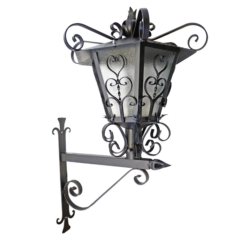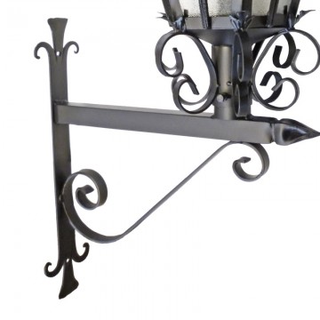 Farol Soporte Pared 1168-2, fabricado en forja artesanal, su diseño es perfecta para casas, bodegas, hoteles, salones de celebración, ect., su estilo con el farol en la parte de arriba cogido con un brazo y acompañado por adornos lo hace mas atractivo.