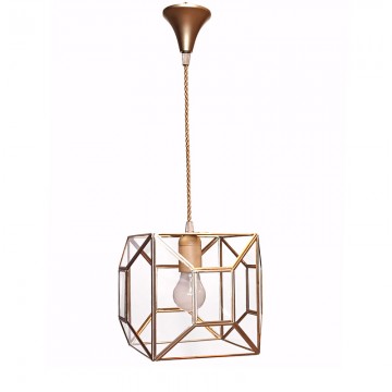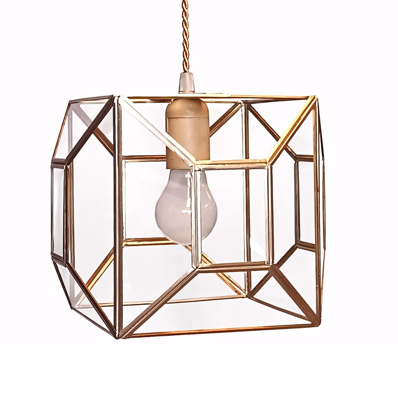 La Lámpara Colgante Artesanal 7455 combina diseño geométrico, elegancia y artesanía en una pieza única de iluminación. Fabricada a mano en latón con acabado dorado y cristal transparente, destaca por su estructura cúbica de líneas limpias que aporta un aire contemporáneo y sofisticado a cualquier espacio.