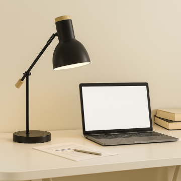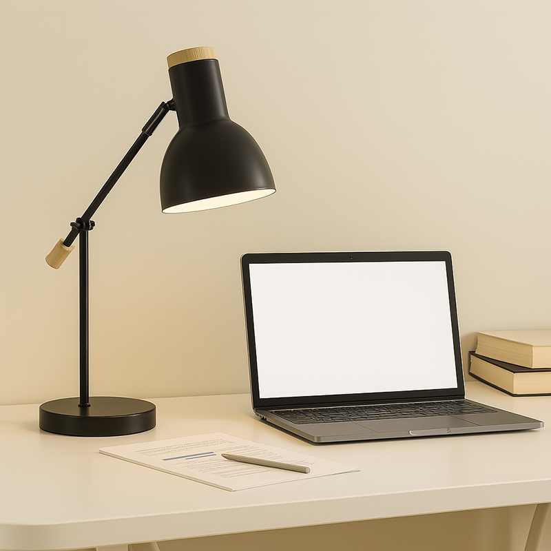 El flexo de escritorio TEJO combina diseño moderno con un aire vintage gracias a su estructura metálica y los elegantes detalles en madera de haya natural. Su estilo atemporal lo convierte en una opción versátil para escritorios de estudio, oficinas en casa o espacios con decoración nórdica, minimalista o rústica.