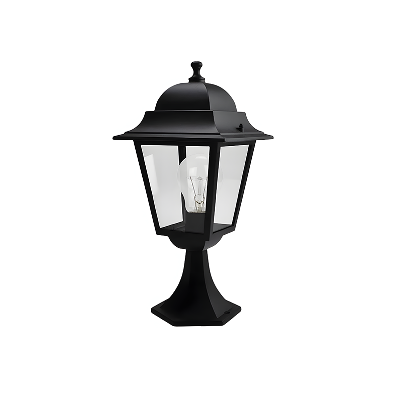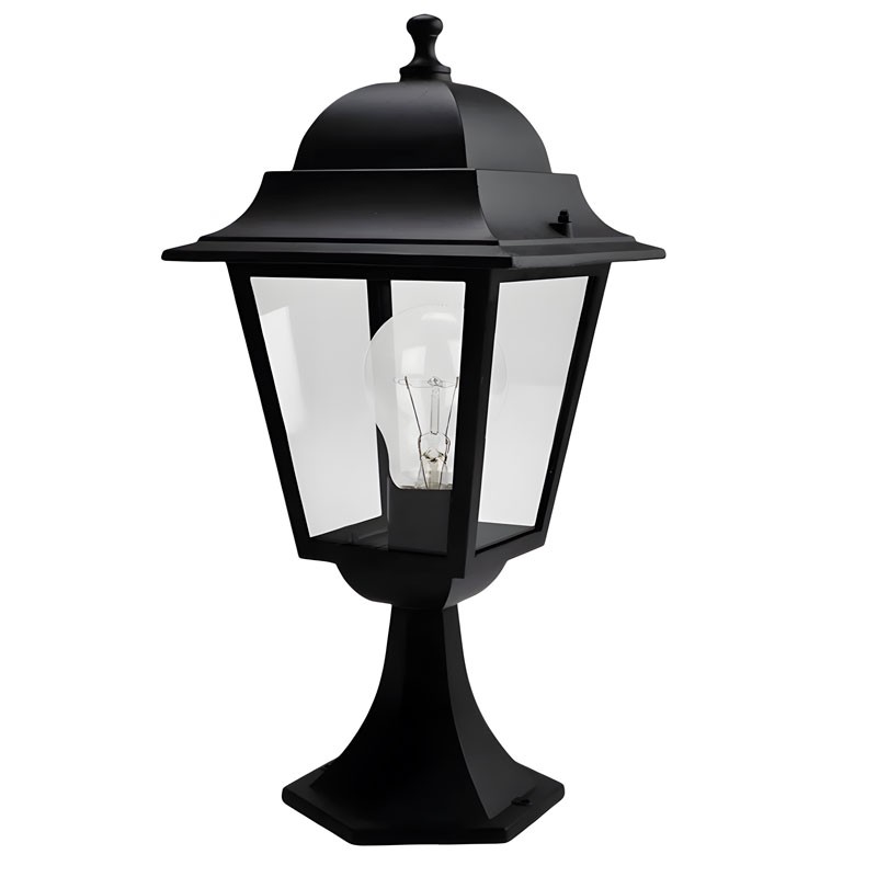 Sobremuro de exterior SPI en color negro, fabricado en aluminio y cristal, estilo clásico, IP44, con portalámparas E27. Elegancia y durabilidad para tu jardín o entrada.